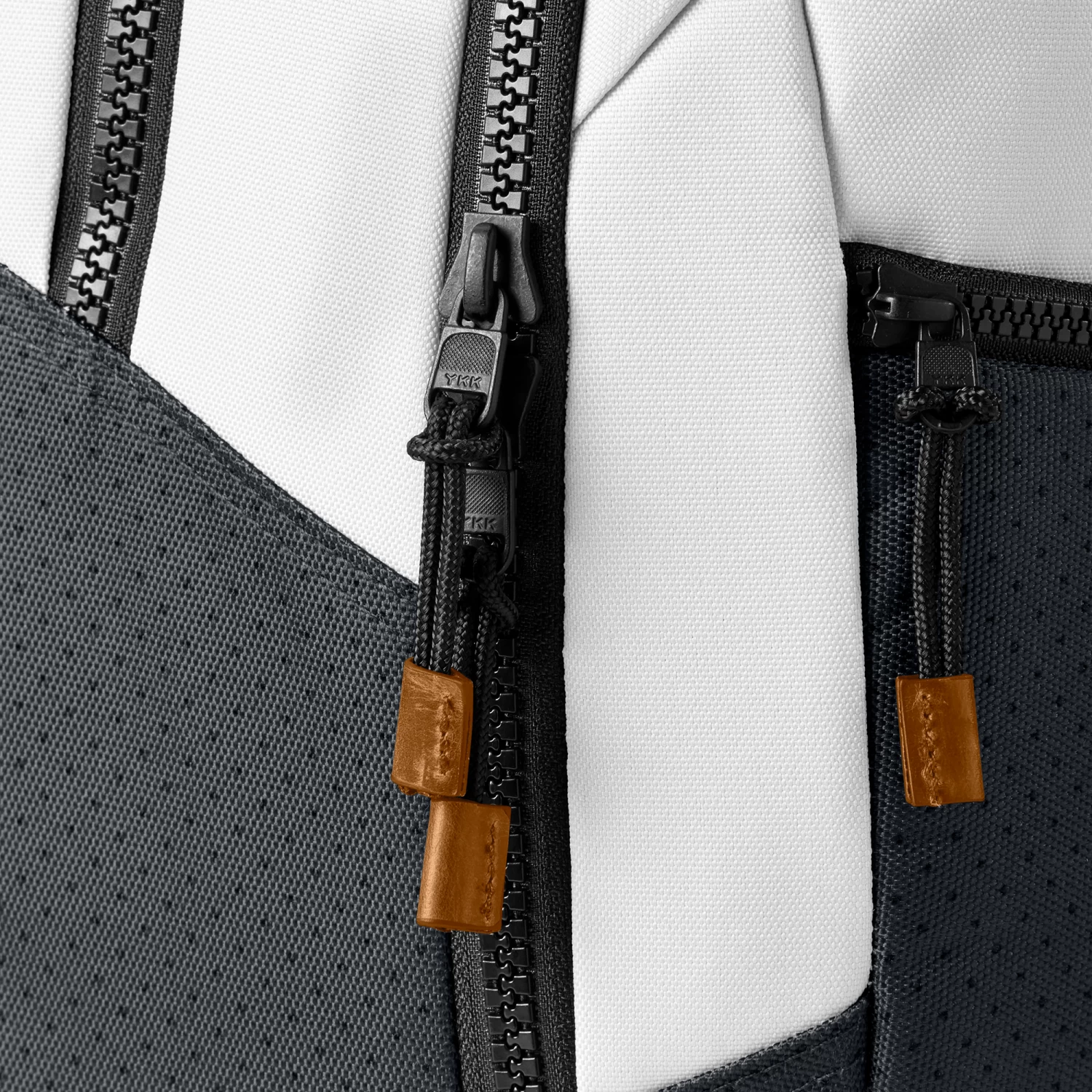 - Corded zipper pulls with leather details with YKK Vislon zippers